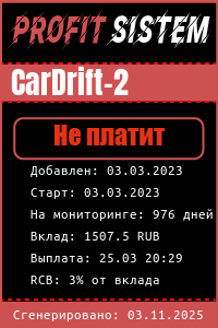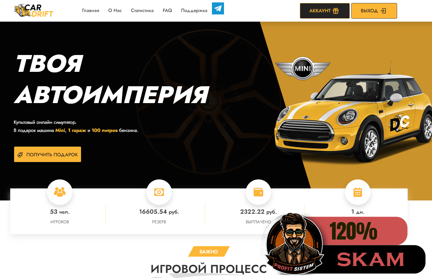 Рестарт проекта 23.03.2023. В первый раз почти удвоили депозиты. Админ нас не подводил. Буду играть дальше:) CarDrift2 - ТВОЯ АВТОИМПЕРИЯ В подарок машина Mini желтого цвета МАШИНЫ Kia - 110% За 24 Часа. 4.58% Каждый Час - От 100р Ford - 116% за 24 Часа. 4.83% Каждый Час - От 1000р Aston Martin - 122% за 24 Часа. 5.08% Каждый Час - От 2000р Dodge - 129% За 24 Часа. 5.37% Каждый Час - От 3000р Ferrari - 150% за 24 Часа. 6.25% в час - От 5000р Alfa Romeo - 200% за 24 Часа. 8.33% в час - От 7000р Популярные платежные системы Выплаты мгновенные, инстантом. Есть чат в Telegram