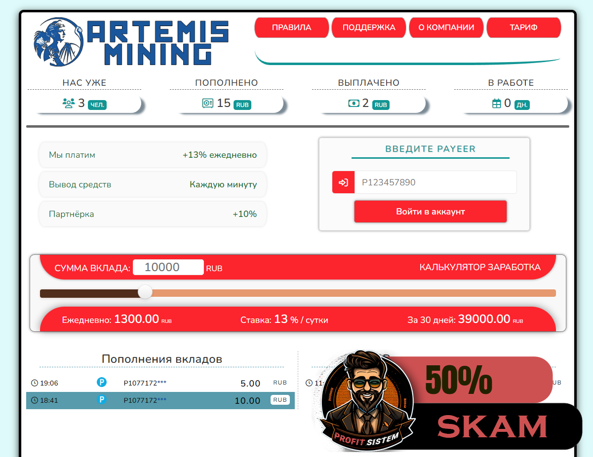 Заскочил в свеженький майнер. Старт состоялся буквально только что. Мы тут одни из первых. Бонус 50 RUB за регистрацию. Маркетинг вкусный. Платит по 13% в сутки. Начисления каждую секунду. Вклад работает на бессрочной основе. Для заработка без вложений и рекламы есть Сёрфинг. Плюс Бонус на баланс 1% от пополнений каждые 24 часа. Из платежных систем только Payeer. Выплаты мгновенные, инстантом.