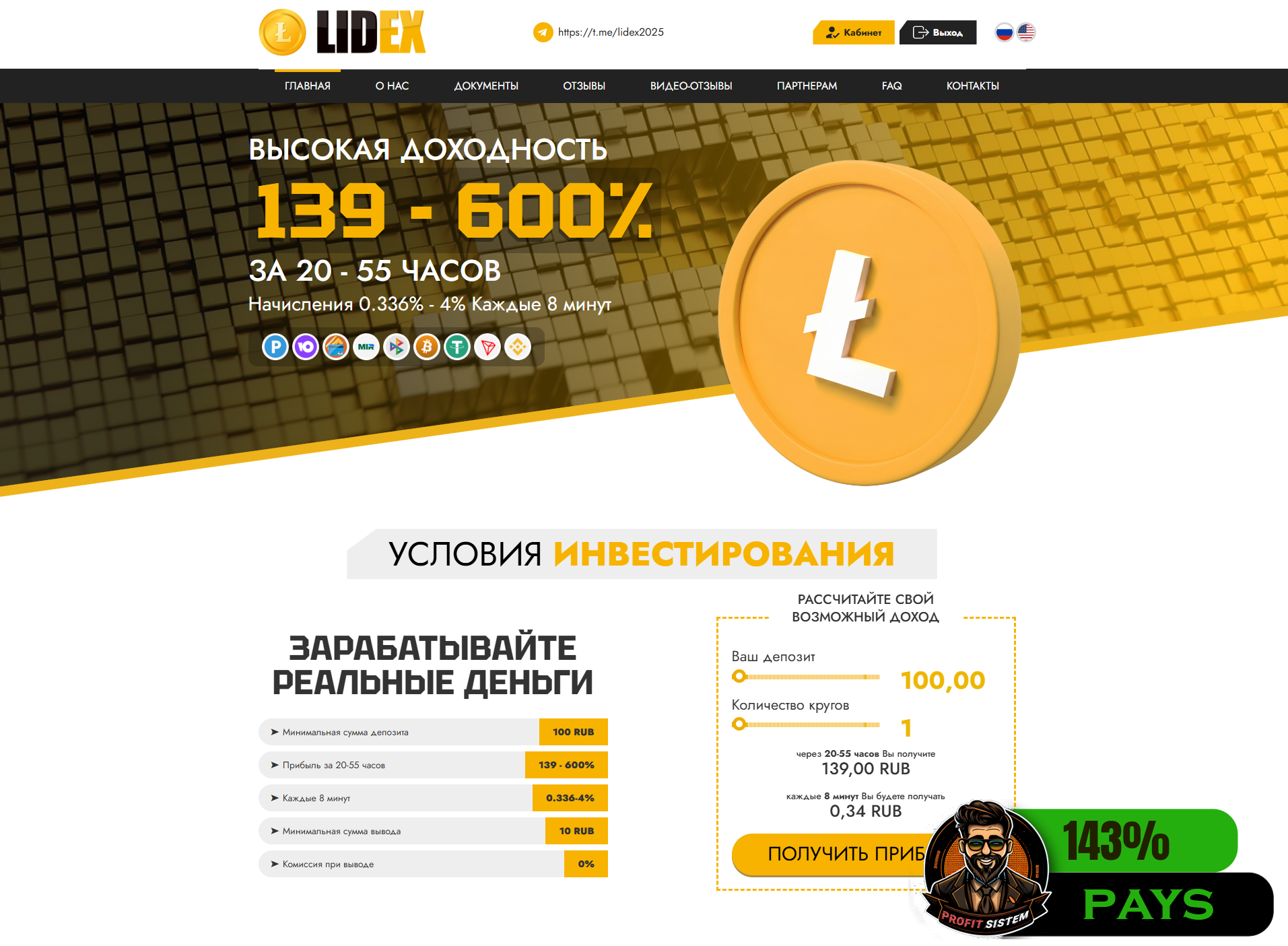 Новинка от всем знакомого Админа ОЛДА :) Начисления в проекте частые. Как работает Админ все знают. Всегда есть возможность заработать ОГРОМНЫЕ ПРОЦЕНТЫ ПРОФИТА За весьма продолжительное время работы. 🔸🔸🔸🔸🔸🔸🔸🔸🔸🔸🔸🔸 Множество тарифных планов. ➤ Минимальная сумма депозита 100 RUB ➤ Прибыль за 20-55 часов 139 - 600% ➤ Каждые 8 минут 0.336-4% 🔸🔸🔸🔸🔸🔸🔸🔸🔸🔸🔸🔸 Популярные платежные системы. Рекомендую использовать 𝗣𝗮𝘆𝗲𝗲𝗿, для получения 𝐑𝐞𝐟𝐁𝐚𝐜𝐤`𝐚 💸 Выплаты мгновенные, 𝐈𝐧𝐬𝐭𝐚𝐧𝐭.